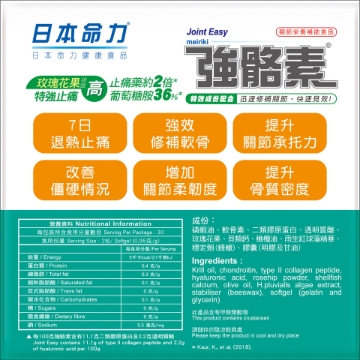 「强骼素」可为关节内的滑膜液补充透明质酸,而透明质酸成份矜贵,外用注射费用昂贵,而口服透明质酸可帮助骨胶原吸收,使滑膜液锁住足够的水份及提供黏性,成为承托力强的关节软垫,其营养素更可透过滑膜液送到软骨组织,有助修补软骨。另外,「强骼素」内的软骨素能帮助制造滑膜液及补充胶原蛋白合成。两者都是维持关节良好运作而不可或缺的营养素。