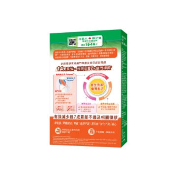 - 专利后生元Pylopass™:能追踪胃部的幽门螺旋菌,能牵制幽门螺旋菌依附于胃壁上,带走并排出体外,根源改善以下胃部不适