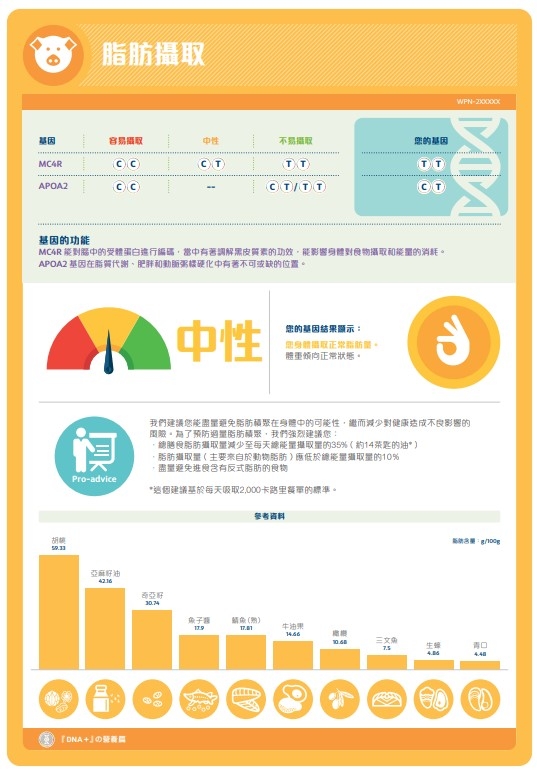 注: 『DNA+』の营养基因测试从23组对新陈代谢、饮食行为、饱足感及对运动反应有影响基因中抽取出来的27个SNPs。用于『DNA+』の营养测试的基因都与您的体重及健康有密切关系,且绝对符合测试的严格要求。