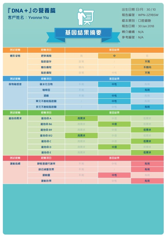 健康人生由基因开始:『DNA+』の营养测试是为您度身订造及助您摄取最佳营养的工具。这个基因测试为您分析影响4大类别,20项的基因状态,当中包括体形姿态、食物敏感度、维他命需求及运动指标。