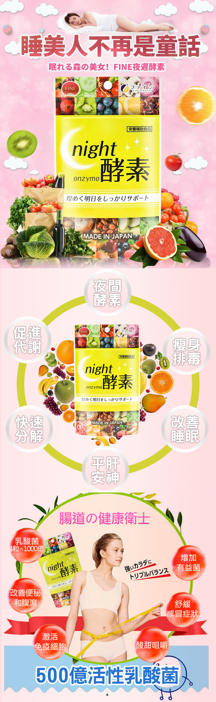 FINE独有的「甘氨酸+ 氨基丁酸(GABA) + 酵母萃取物」配方,助妳轻松入睡和在睡眠中活化肌肤,抗压及放松肌肉,含有丰富大量纤维素,维他命,抗氧化及氨基酸等营养成份。