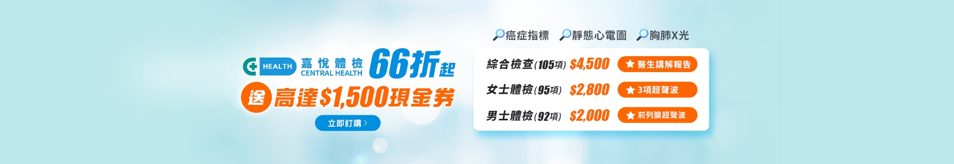 重點檢查項目:超聲波檢查 (5選1)、癌症指標測試 (6選2)、上腹部超聲波、三高檢查 (糖尿、血壓及血脂)、心臟檢查、幽門螺杆菌抗體