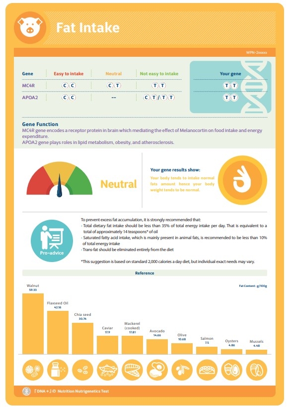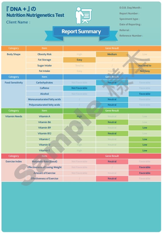 Your nutritional needs are unique to you alone. Your nutrition, your genes, your lifestyle and the environment that you expose to that all interact with each other and affect the outcome.『DNA+』@ Nutrition Nutrigenetics Test is designed to assist with effective weight management of body weight by guiding diet and exercise programs based on the genetics differences in metabolism, fat adsorption and other related areas.