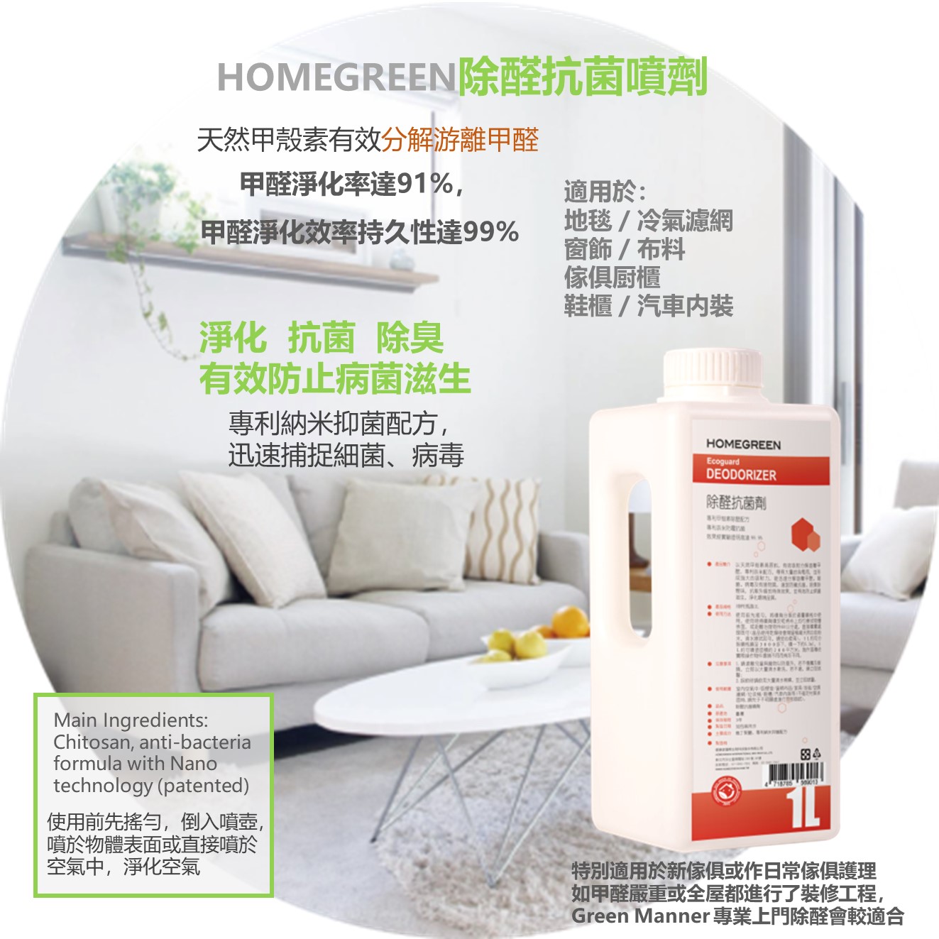 GREEN MANNER adopts the chitosan products registered by Taiwan HOMEGREEN, which are naturally extracted, safe and free of heavy metals. They can decompose formaldehyde effectively, and at the same time, antibacterial, mildew-proof and environmentally friendly.