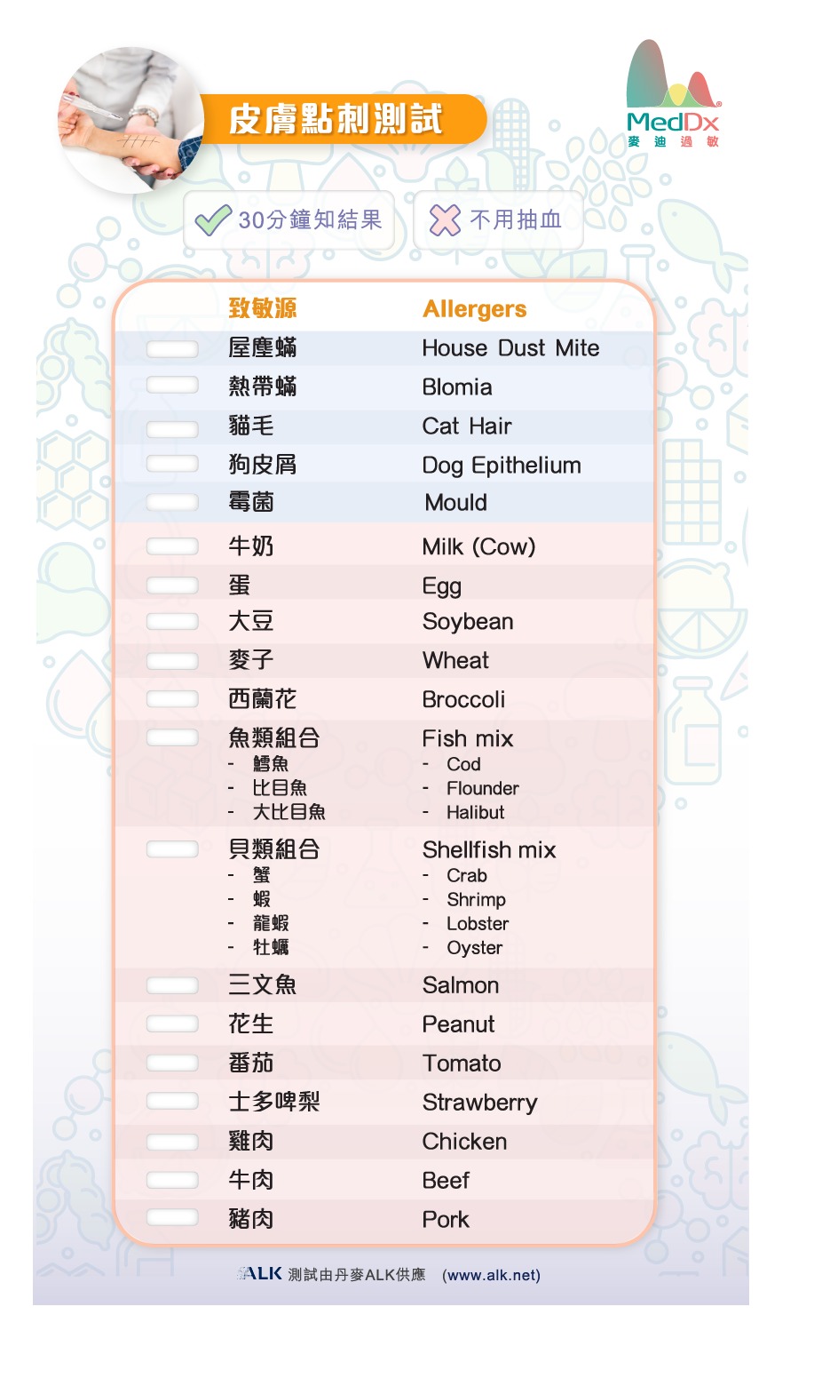 The skin prick test is supplied by ALK of Denmark and has three major characteristics: fast, reliable, and does not require blood drawing.