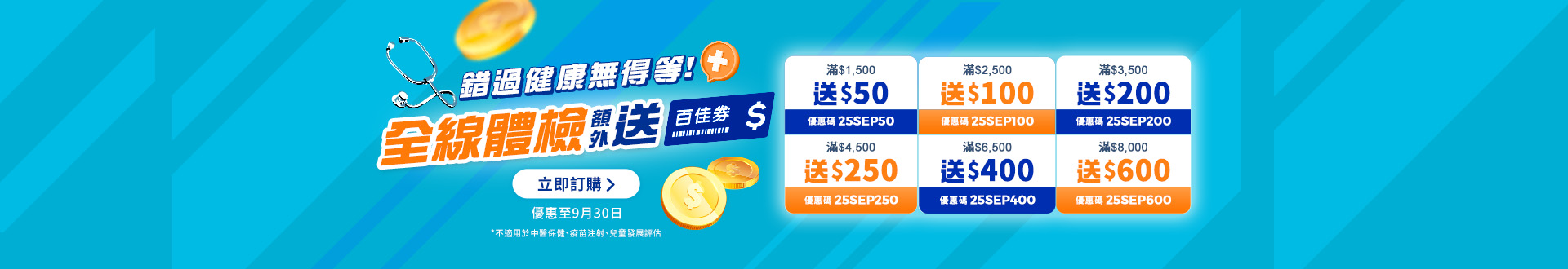 重點檢查項目:超聲波檢查 (5選1)、癌症指標測試 (6選2)、上腹部超聲波、三高檢查 (糖尿、血壓及血脂)、心臟檢查、幽門螺杆菌抗體