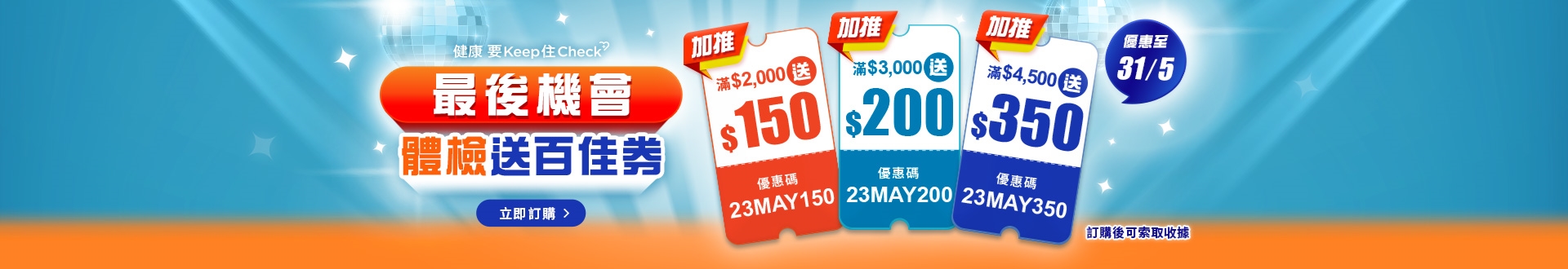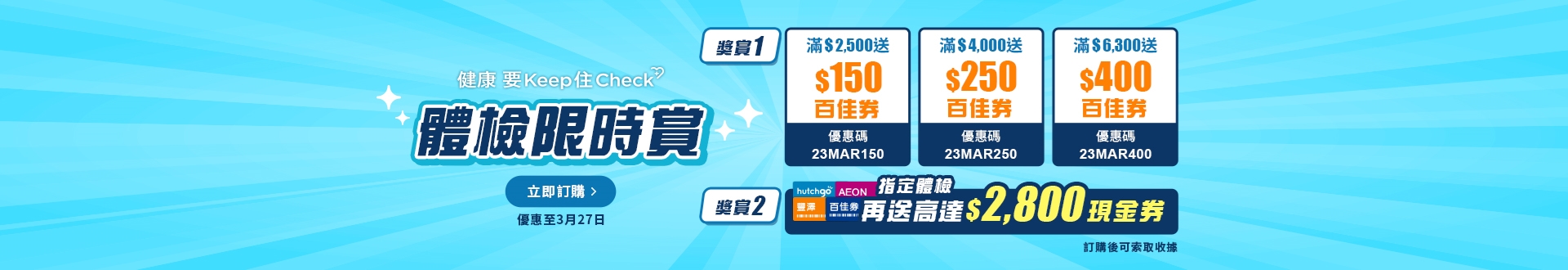 重點檢查項目:超聲波檢查 (5選1)、癌症指標測試 (6選2)、上腹部超聲波、三高檢查 (糖尿、血壓及血脂)、心臟檢查、幽門螺杆菌抗體