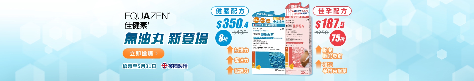 Equazen英國佳健素擁有20多年魚油研究經驗,提供不飽和脂肪酸:奧米加3,奧米加6 (DHA、EPA、GLA),適合不同階段使用。添加天然月見草油,提供護腦抗炎成份GLA,與魚油EPA協同作用,加強補腦護眼及保健效果。經牛津大學及多項臨床證實。獲GOED,海洋之友,PureMax魚油純淨認證和歐洲安全標準。