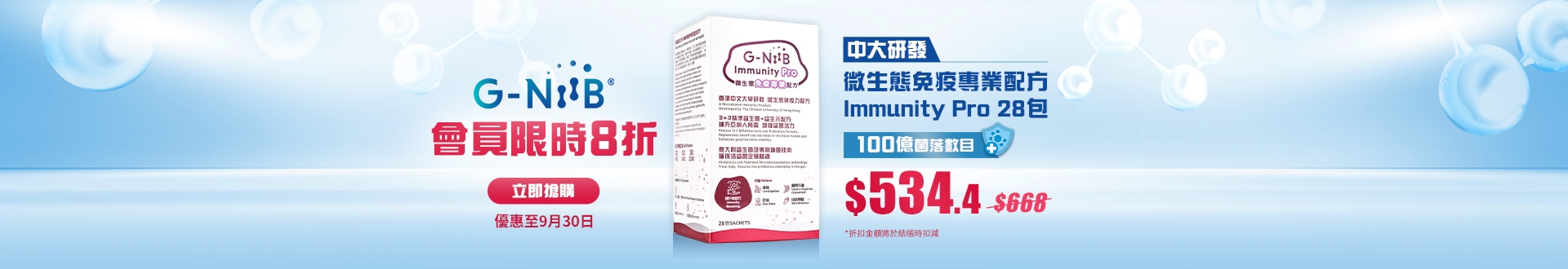 G-NiiB由香港中文大學衍生出來的生物科技公司,G-NiiB由世界知名的臨床醫生科學創立。G-NiiB專為亞洲人的腸道環境而設,並對香港本地新型病毒病人進行臨床測試其成效及安全性。G-NiiB含天然活菌種,有助平衡腸道微生態、強化免疫系統、提高抵抗力及加快痊癒。G-NiiB富含青春雙歧桿菌,不但能增強人體免疫力,提高新冠疫苗成效、紓緩或減輕後遺症的症狀。