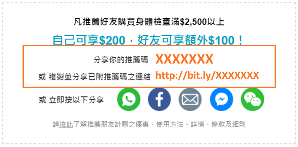 受薦人需在單一訂單中訂購滿$2,500或以上的體檢計劃,並在購買時輸入推薦碼,才被視為成功推薦。