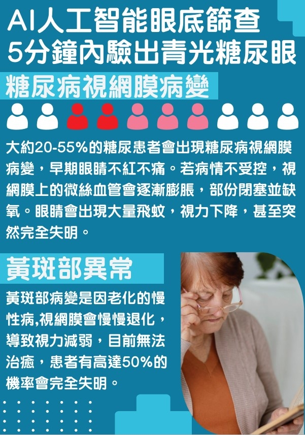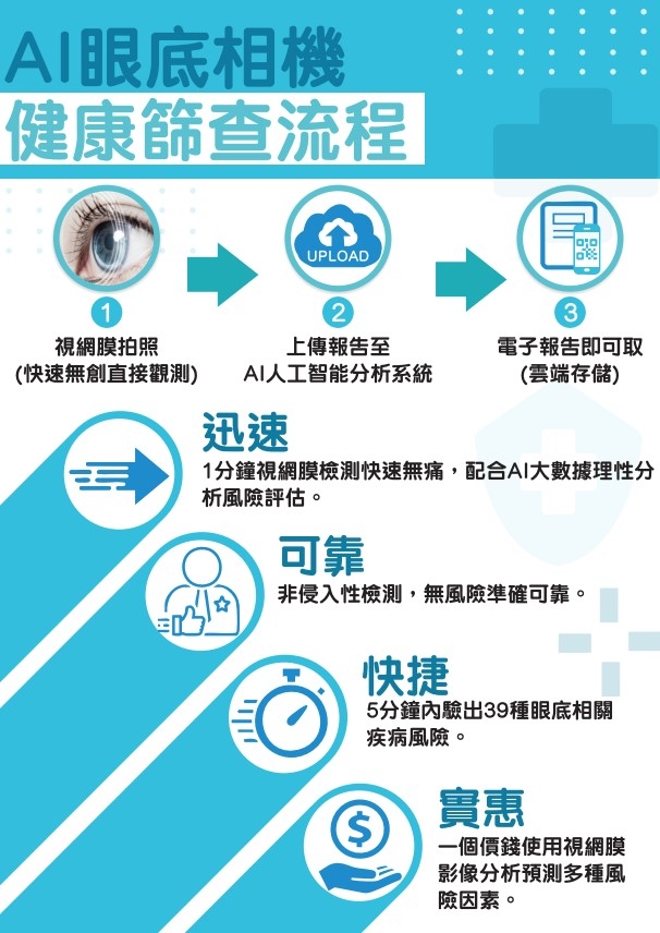 AI眼底相機健康篩查:健康篩查當天由中心工作人員講解報告,本中心會即時提供實體報告。