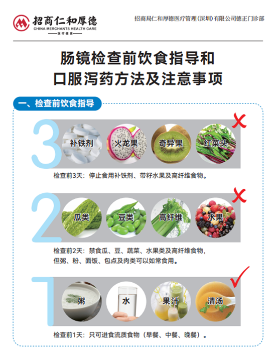 - 檢查前2天:禁食瓜、豆、蔬菜、水果類及高纖維食物,但粥、粉、面飯、包點及肉類可以如常食用。