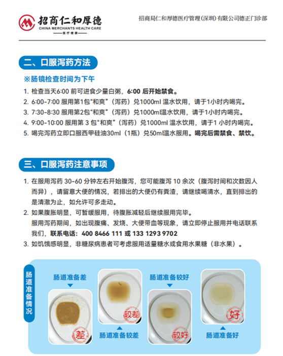 - 如果腹脹明顯,可暫緩服用,待腹脹減輕後繼續服用完畢。服用瀉藥期間,如出現腹痛、發燒、大便帶血等現象,請立即停止服用並電話聯絡招商局仁和厚德醫療管理(深圳)有限公司德正門診部,聯絡電話:+86 400 8466 111或+86 13312939702。