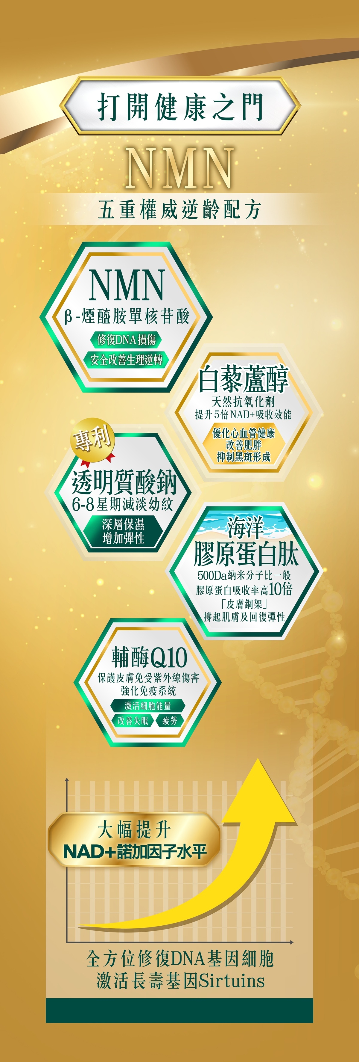 • 每粒含250mgNMN + 50mg白藜蘆醇 + 50mg專利透明質酸鈉 + 50mg海洋膠原蛋白肽 + 50mg輔酶Q10