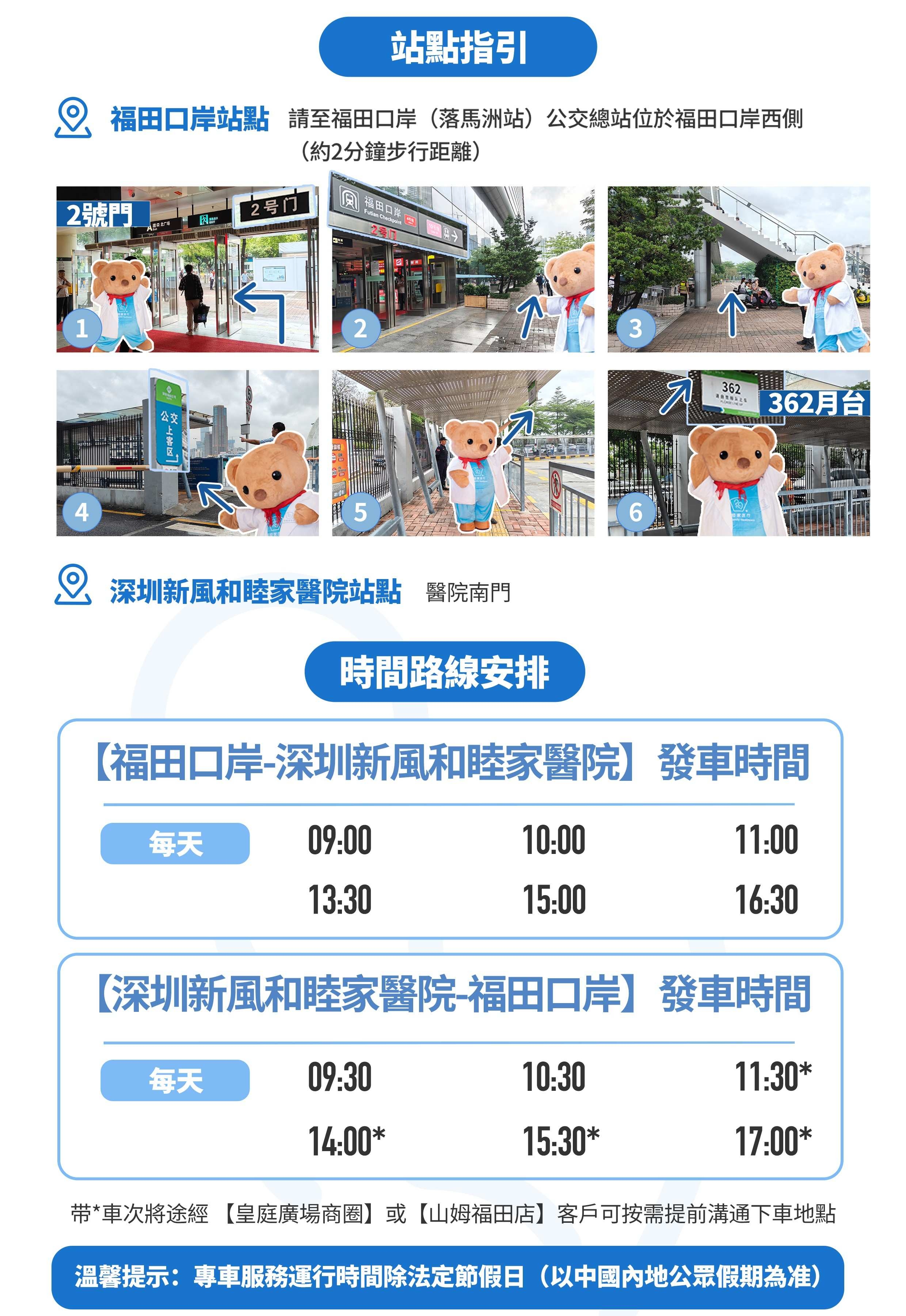 專車定時定點從福田口岸/醫院開出,專車服務全程免費,座位遵循先到先得原則,如遇滿座請等候下一班車。