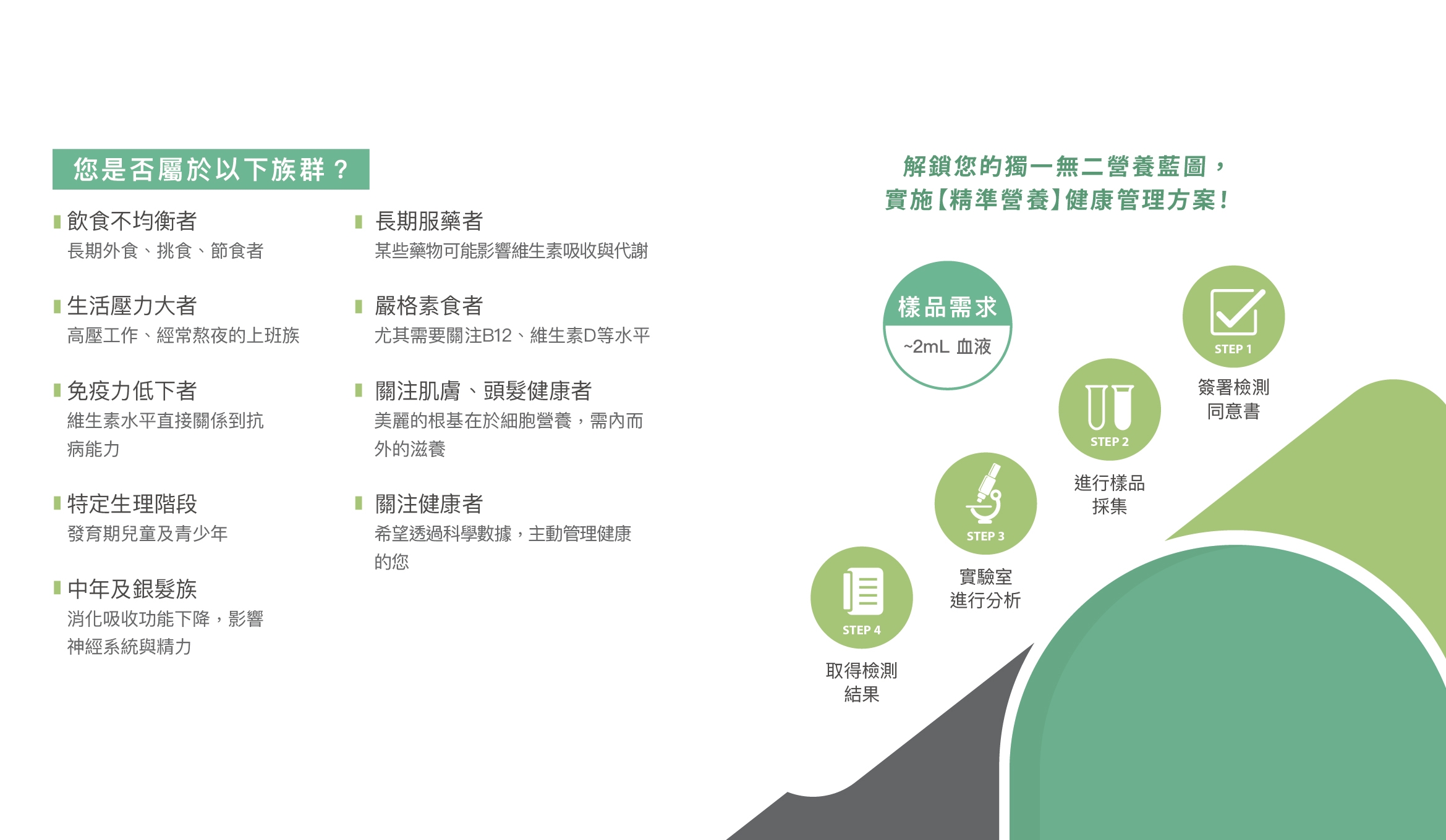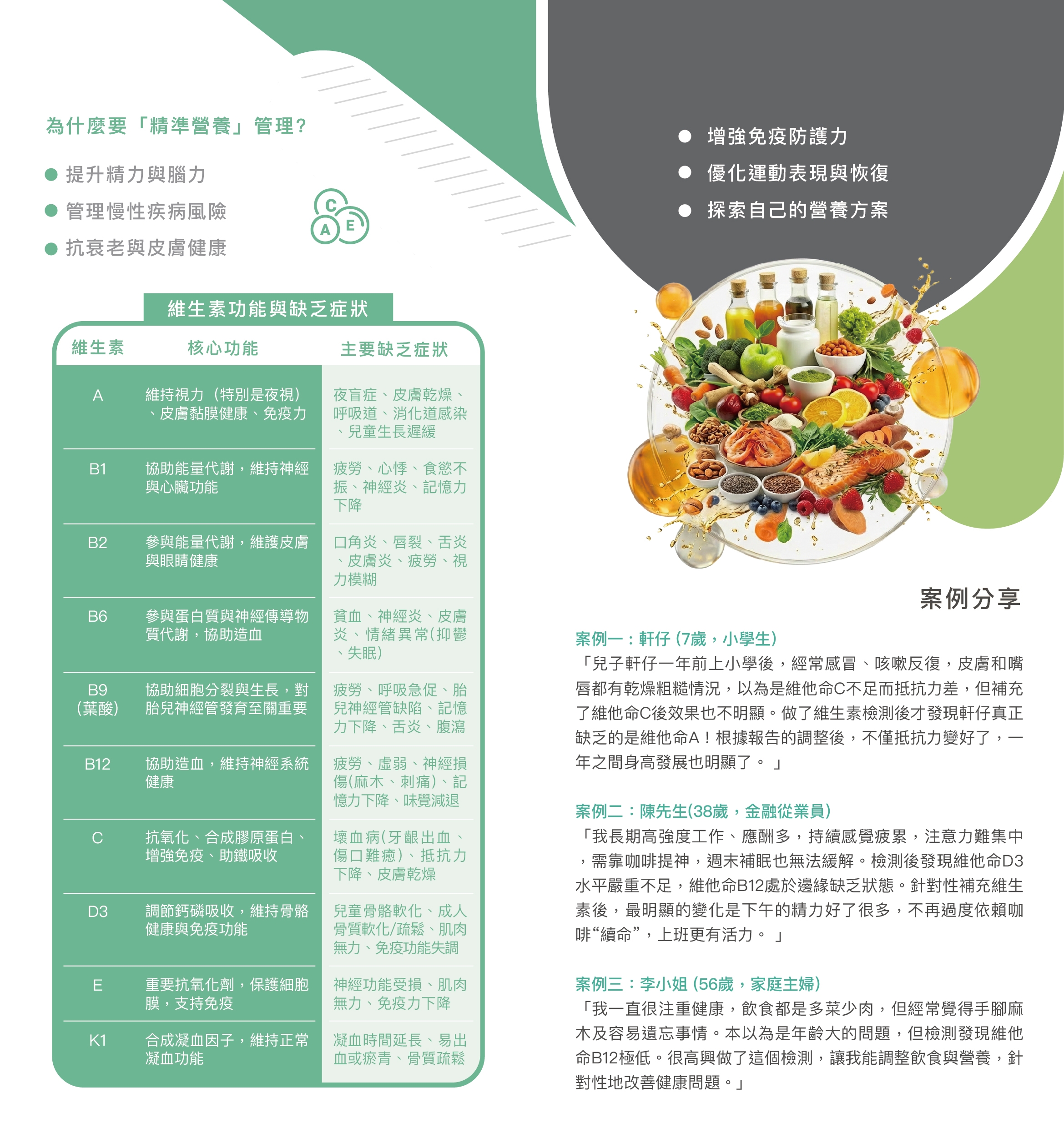 維生素(維他命)是人體新陳代謝不可或缺的微量營養素,缺乏或過量都會對健康造成不良影響。維生素水平不僅取決於您「吃了什麼」,更取決於您的身體「如何處理」這些營養素,但每個人的體質都是獨一無二的。檢測身體維生素水平,基於自身的檢測數據及身體狀況,選擇最適合自己的營養方案,從而增強免疫防護力;提升精力;管理慢性疾病風險;抗衰老與改善皮膚等。