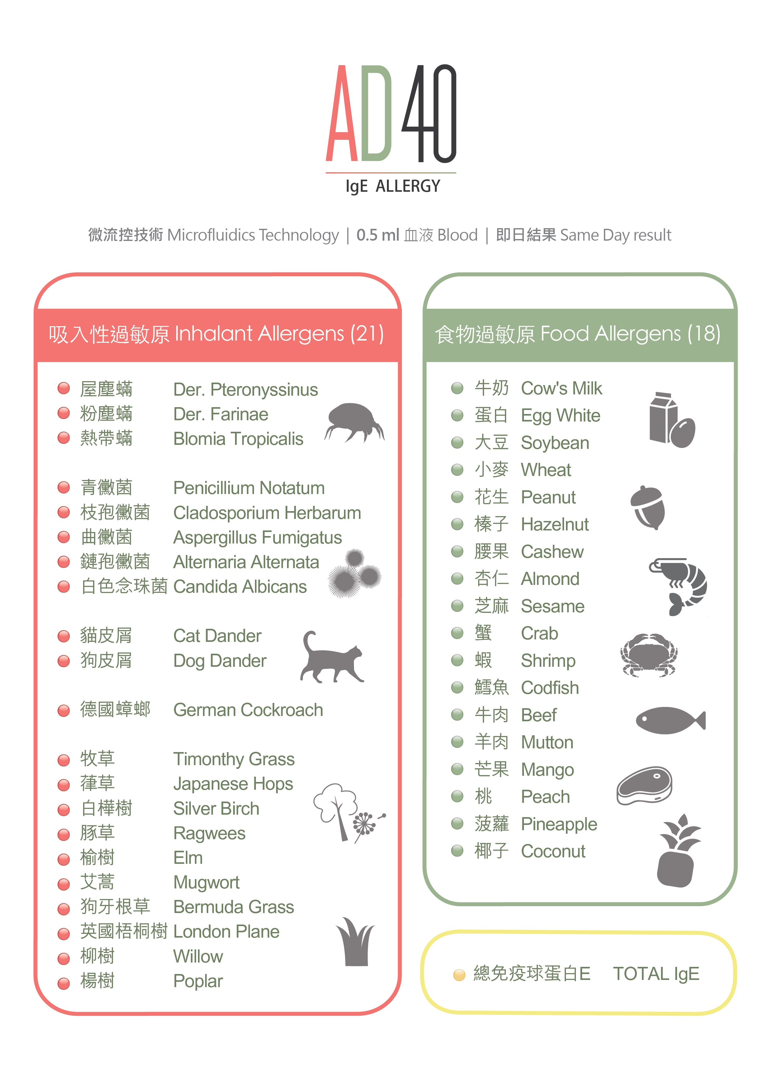 - 測試 40種食物及環境致敏原