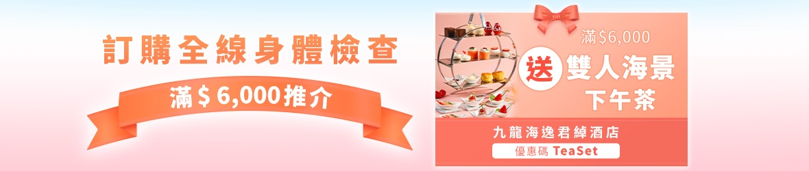 💖訂購身體檢查 滿$6,000,使用優惠碼「TeaSet」,額外獲贈 九龍海逸君綽酒店 雙人海景下午茶 (價值 $670)。在壯麗海景下悠閒談心,讓媽媽忘卻日常勞碌,享受貴婦級假期。