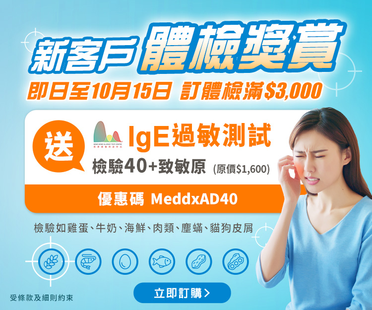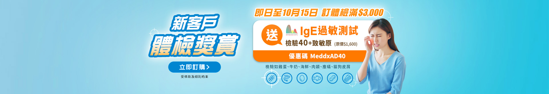 於2025年10月15日前,訂購全線體檢滿$3,000,額外送 香港過敏測試中心 AD40 (IgE) 過敏測試一次 (原價HK$1,600)!