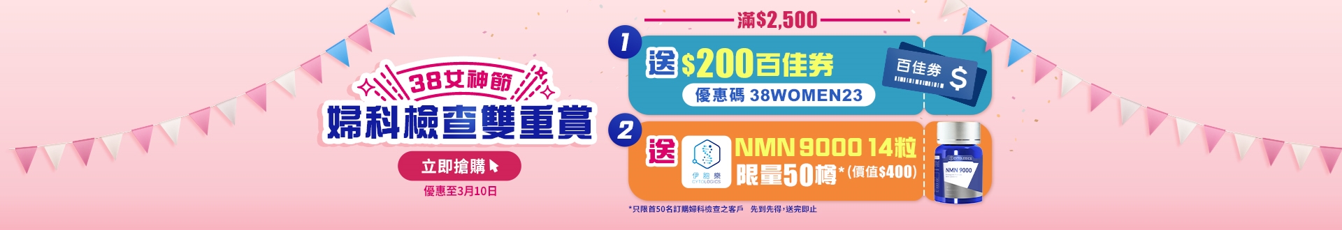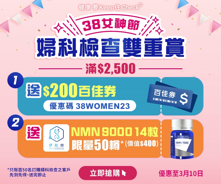 由3月3至10日,健康網購為您送上「38婦女節」婦科檢查雙重賞*!第一賞,訂婦檢滿$2,500輸入「38WOMEN23」送$200百佳券;第二賞,首50名更可獲得Cytologies NMN18000 鉑金版(14粒)一樽(價值$400)。