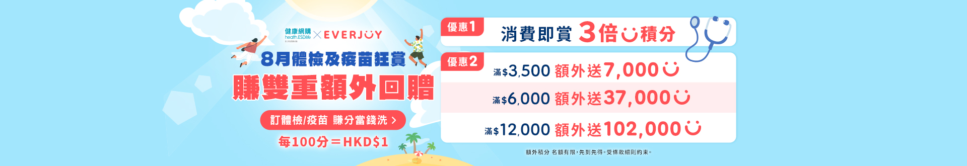 - 重點檢查項目:超聲波檢查 (5選1)、癌症指標測試 (7選2)、靜臥心電圖、胸部 X 光、三高檢查 (糖尿、血壓及血脂)
